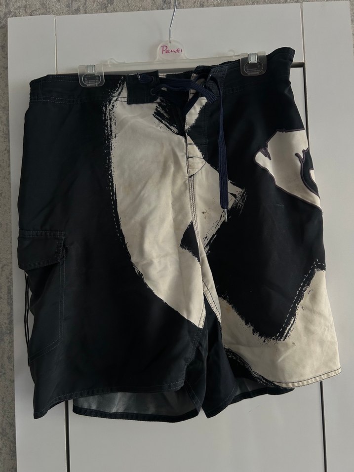 Siyah renkli, bol kesim erkek mini şort, büyük beyaz grafik baskılı, bel detaylı ve yan cepli, sokak stili için uygun.