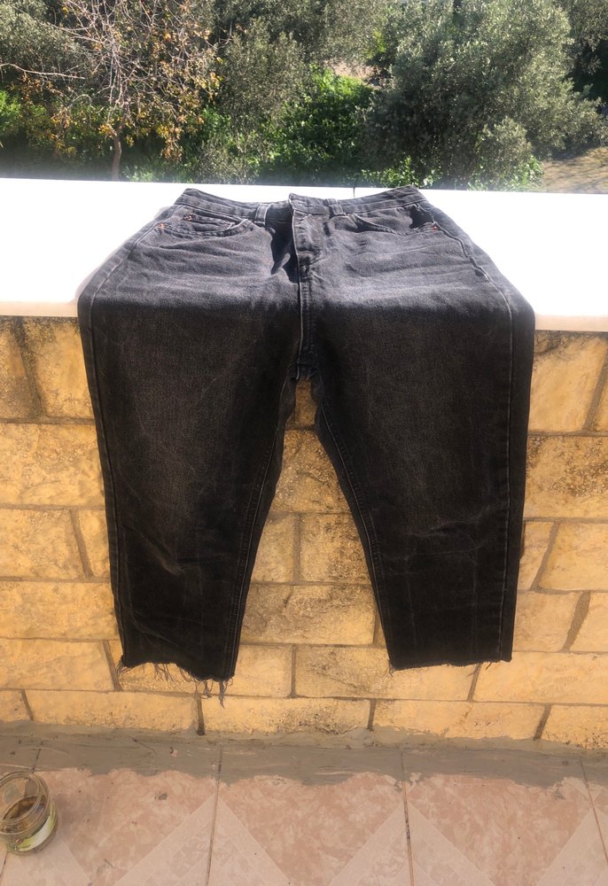 Siyah kot kumaştan, bol kesim ve midi boyda, kemer detaylı kadın pantolon. Rahat sokak stili ve dış mekan kullanımı için uygun, yumuşak ve hafif aşınmış görünümlü kumaş ile.