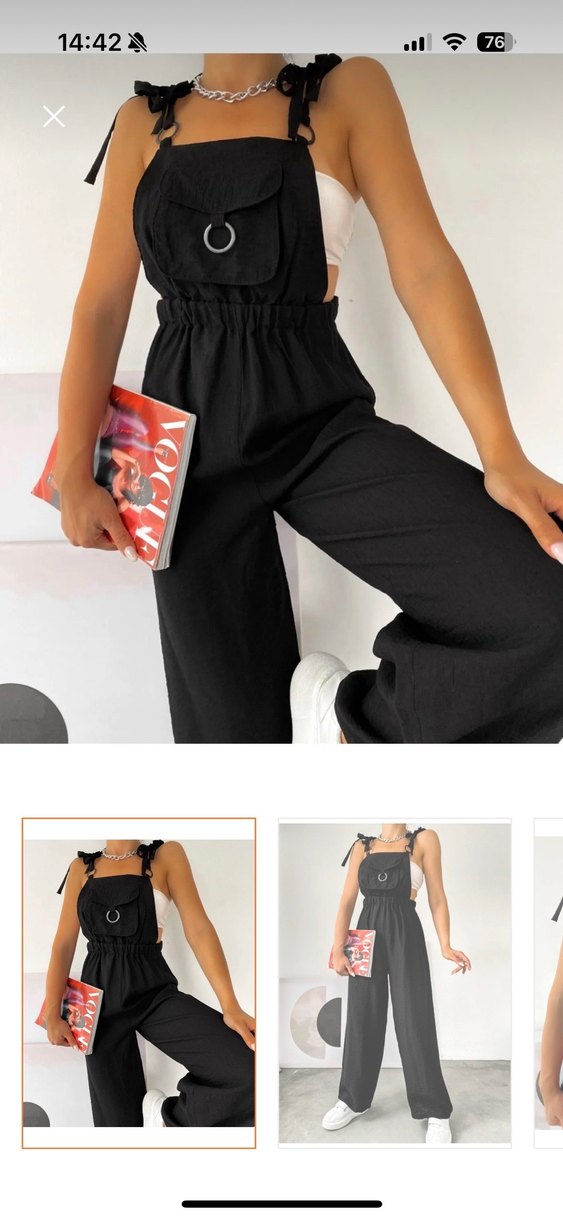 Siyah, bel detaylı ve askılı kollara sahip straplez kadın tulum. Sentetik kumaştan, bol kesim ve midi boyda, günlük sokak stiline uygun.