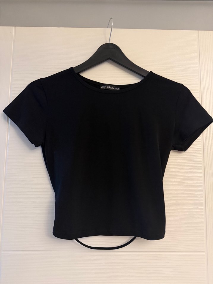 Siyah süet kumaştan kısa kollu, bisiklet yaka crop top. Fit kesimiyle şık ve rahat bir görünüm sunar.