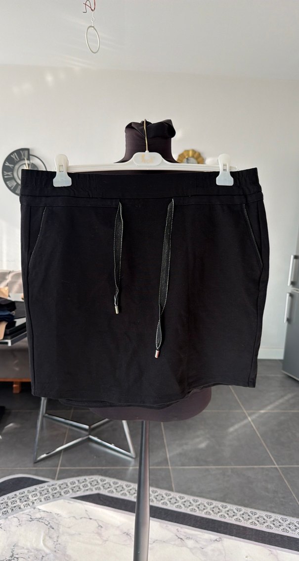 Siyah mini etek, bel detaylı ve bağcıklı, rahat sentetik kumaştan, günlük kullanıma uygun.