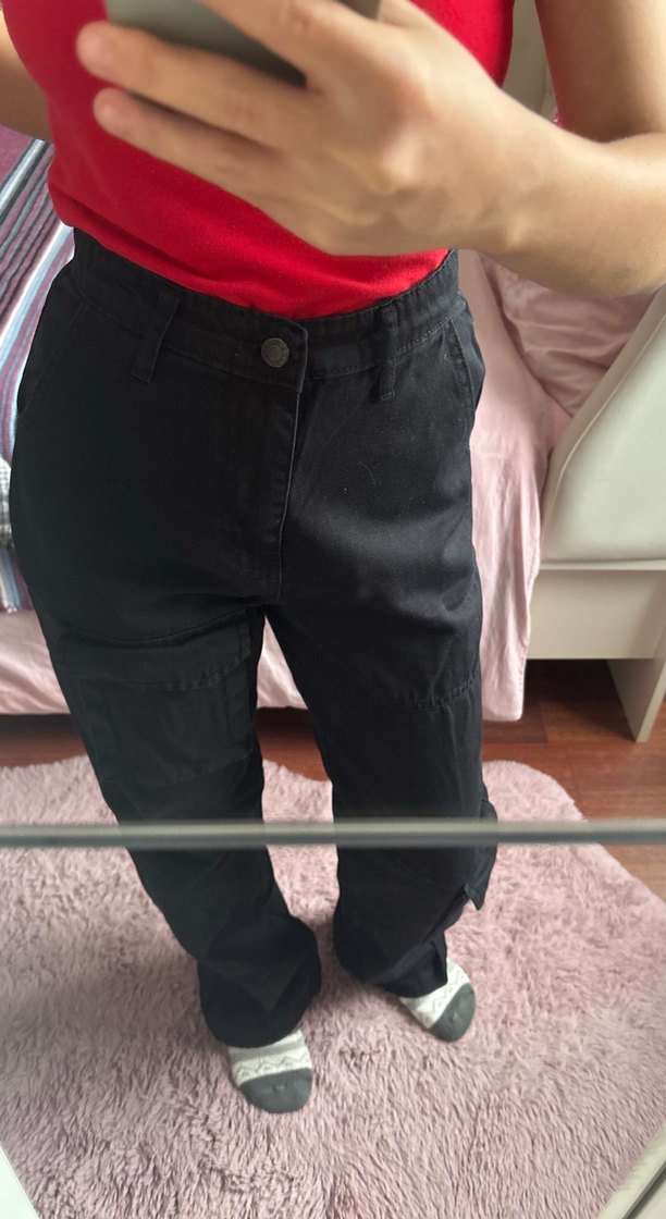 Siyah, bel detaylı, rahat kesim denim pantolon. Günlük kullanım için uygun, desen içermeyen midi boy streetwear tarzı jean.