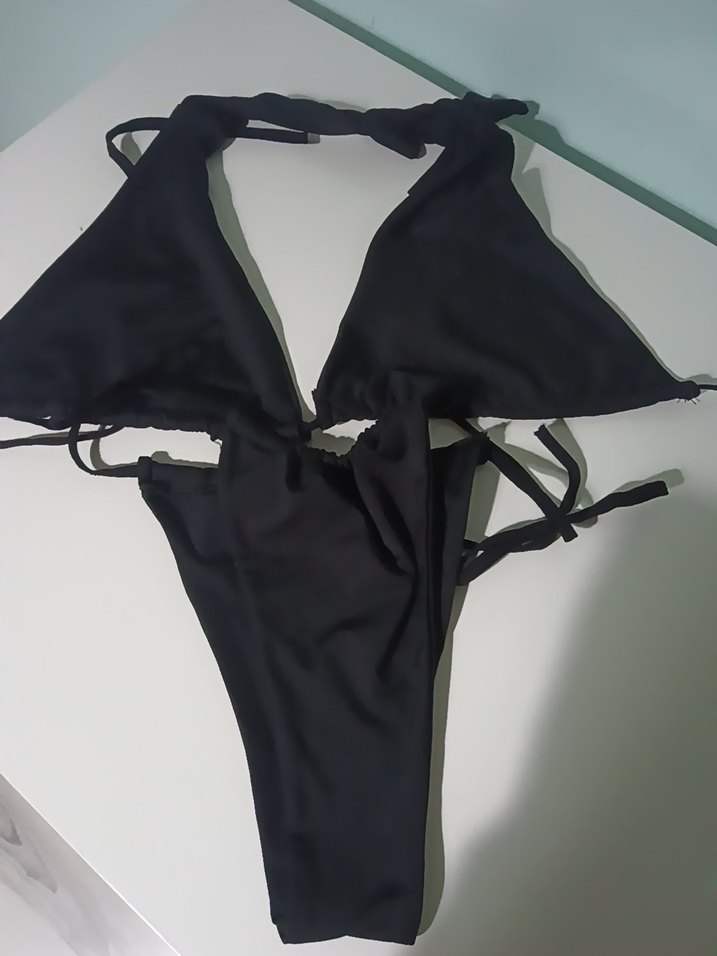 Fıt kesim, siyah renkte, strappy askılı ve bel detaylı bikini. Cesur ve avant-garde tarzıyla açık hava için uygundur.