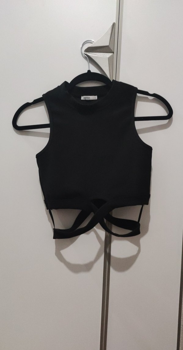 Siyah, vücuda oturan crop top, halter yaka ve ince askılara sahip. Bel kısmında kemer detayları vardır. 1 kez giyilmiştir.