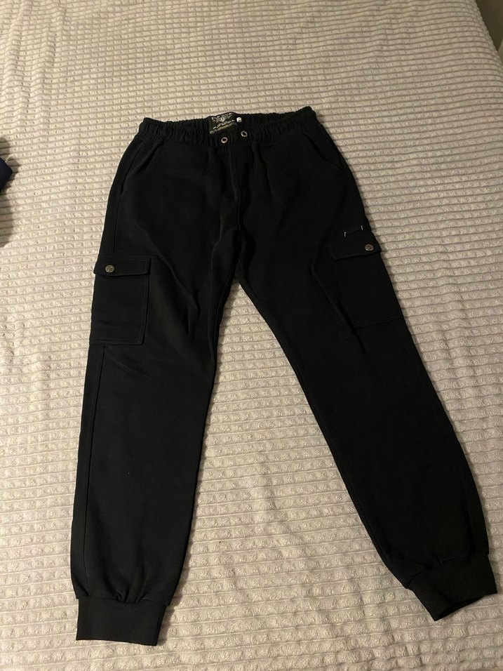Siyah, kemerli, yan cepli erkek outdoor eşofman, bol kesim ve midi boyda, sentetik kumaştan üretilmiştir. Top gun markasına aittir
