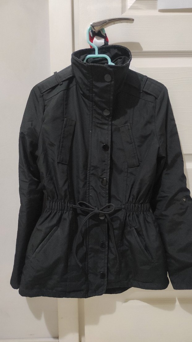 Siyah Bel Lastikli ve yüksek yakalı kadın ceketi, dar kesim ve midi boyda. Uzun kollu, sentetik kumaştan, minimalist sokak stilini yansıtır.