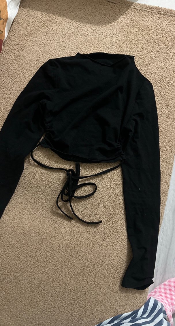 Siyah, ip bağlamalı, uzun kollu ve yüksek yakalı dar kesim bluz.