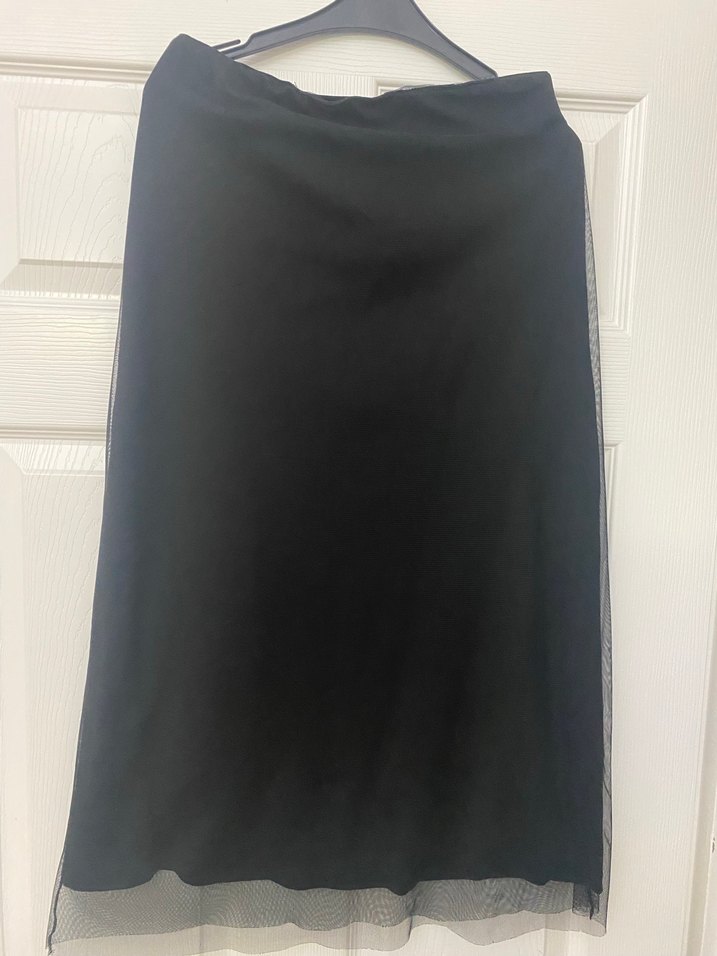 Siyah,, uzun ve oturan kesim içi pamuklu üstü tüldenyapılmış kadın eteği, ofis için uygundur.