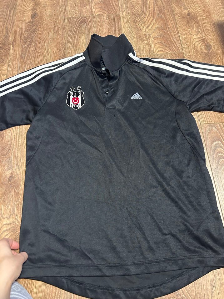 Düğmeli polo yaka ve baskılı Beşiktaş logosu ile siyah, kısa kollu, dar kesim forma. Adidas şeritleri ve yumuşak, sıcak kumaş içerir. ⚽ Orijinal Beşiktaş Adidas forma. S beden. Hiçbir deformemesi yok. Gelir destek içindir. Fiyat 300 TL