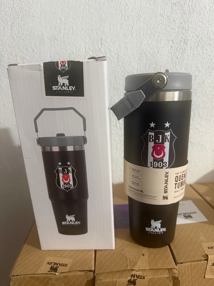 siyah termos matara, dayanıklı tasarım ve güvenli kulpla Beşiktaş armalı. İçecekleri sıcak tutar, 'QUE' işaretlidir. Çocuklar için uygun.