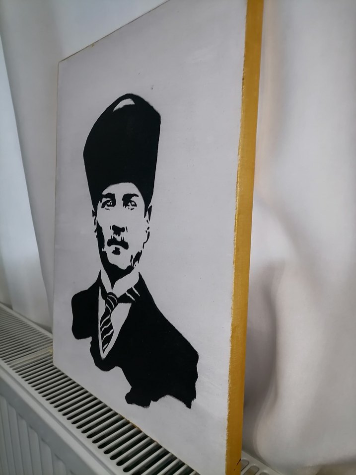 Bu tablo, beyaz zemin üzerinde siyah beyaz Atatürk portresi ve sarı kenar ile sade ve etkileyici bir eserdir. Kendim yapıyorum