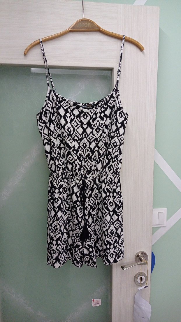 Siyah beyaz desenli, ince askılı, V yakalı, belinde bağcıklı ve bohem tarzda tulum. Rahat kesim ve sentetik kumaştan üretilmiştir.