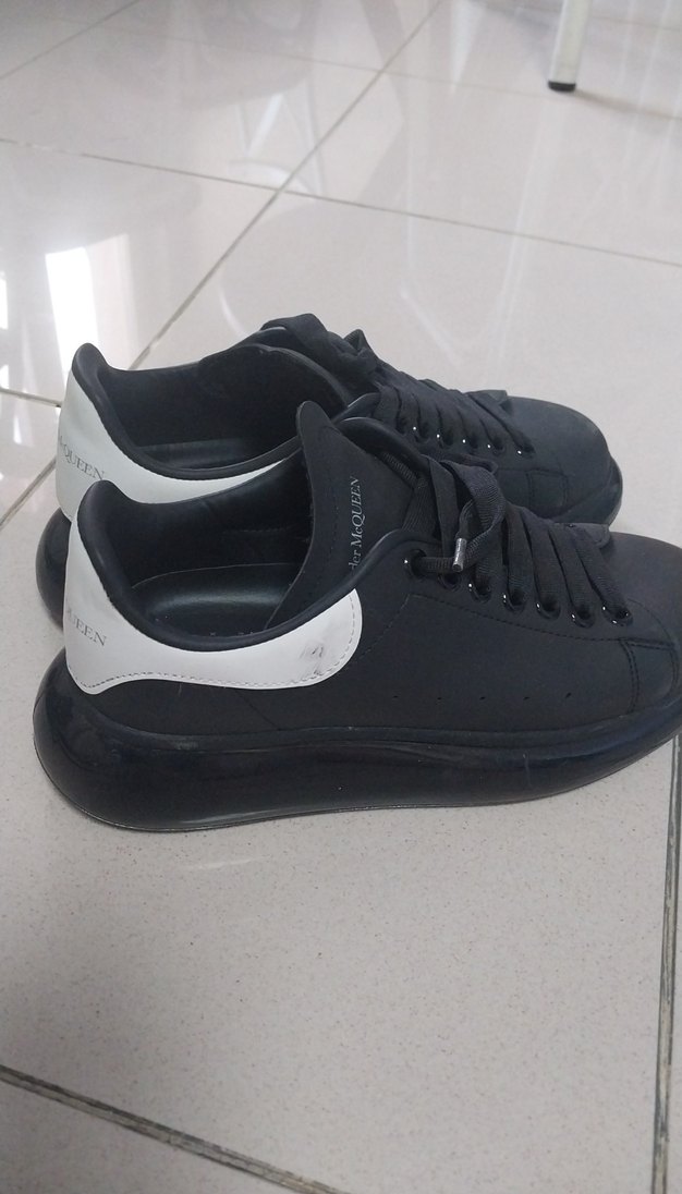 Bağcıklı, siyah beyaz erkek spor ayakkabısı. Kauçuk tabanlı, desensiz tasarımıyla spor ve günlük sokak modasına uygun. mezuniyette bir kez giyildi