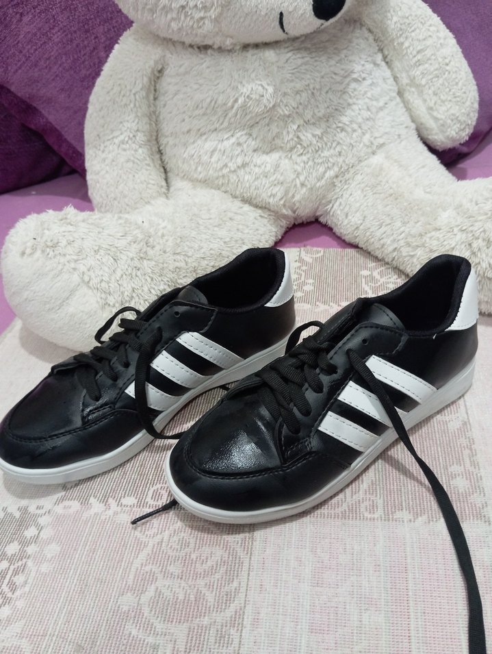 Bağcıklı, siyah beyaz renklerde, zebra desenli kadın spor ayakkabısı. Kauçuk tabanlı, sportif ve rahat tasarım.