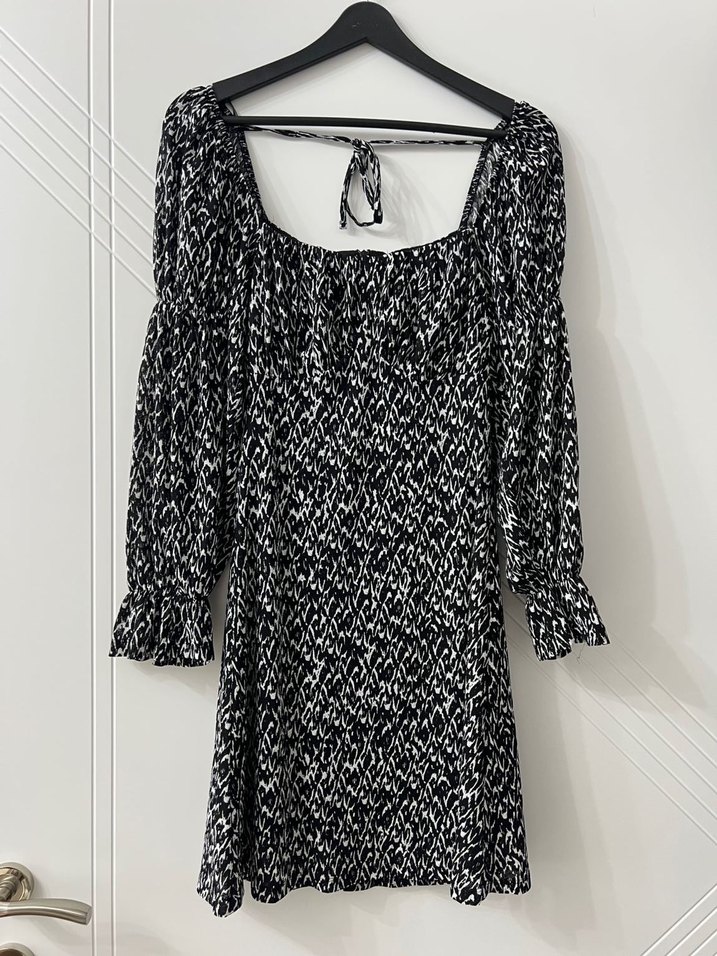 Uzun kollu, bağcıklı ve fırfırlı detaylı siyah beyaz mini elbise, rahat kesimi ve tekne yaka tasarımı ile sokak stiline uygun.