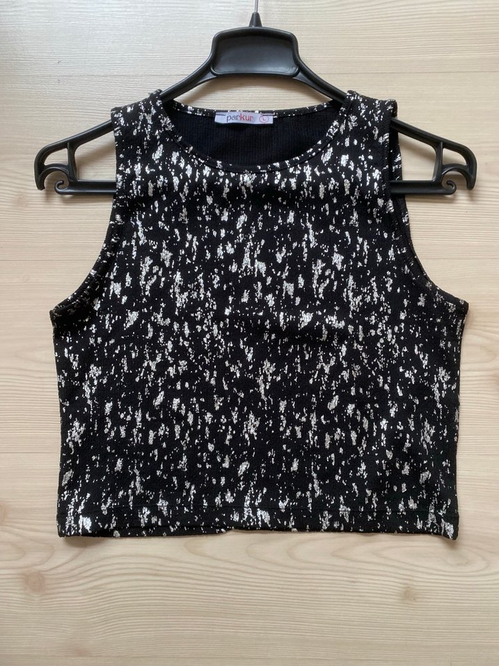 Yüksek yakalı, kolsuz ve fit kesimli bu crop top siyah beyaz bağlama desenlidir. Örgü görünümlü sentetik kumaştan yapılmıştır, günlük kullanıma uygundur.