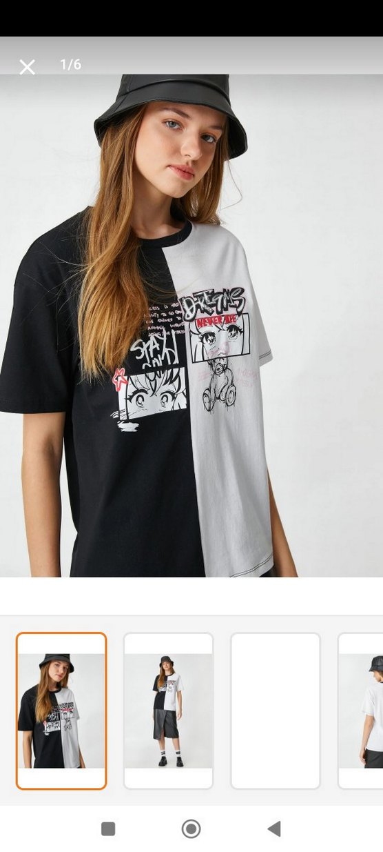 Kadınlar için bol kesim, kısa kollu ve yuvarlak yakalı sokak stili tişört. Siyah ve beyaz renklerde, ön kısmında baskılı grafikler bulunur. Sentetik kumaştan üretilmiştir, günlük kullanım için uygundur.