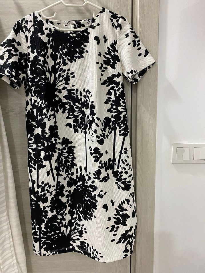 Beyaz midi elbise, kısa kollu ve yuvarlak yakalıdır. Siyah büyük çiçek baskısı ve bol kesimiyle çağdaş minimal tarz sunar. Günlük kullanım için uygundur.