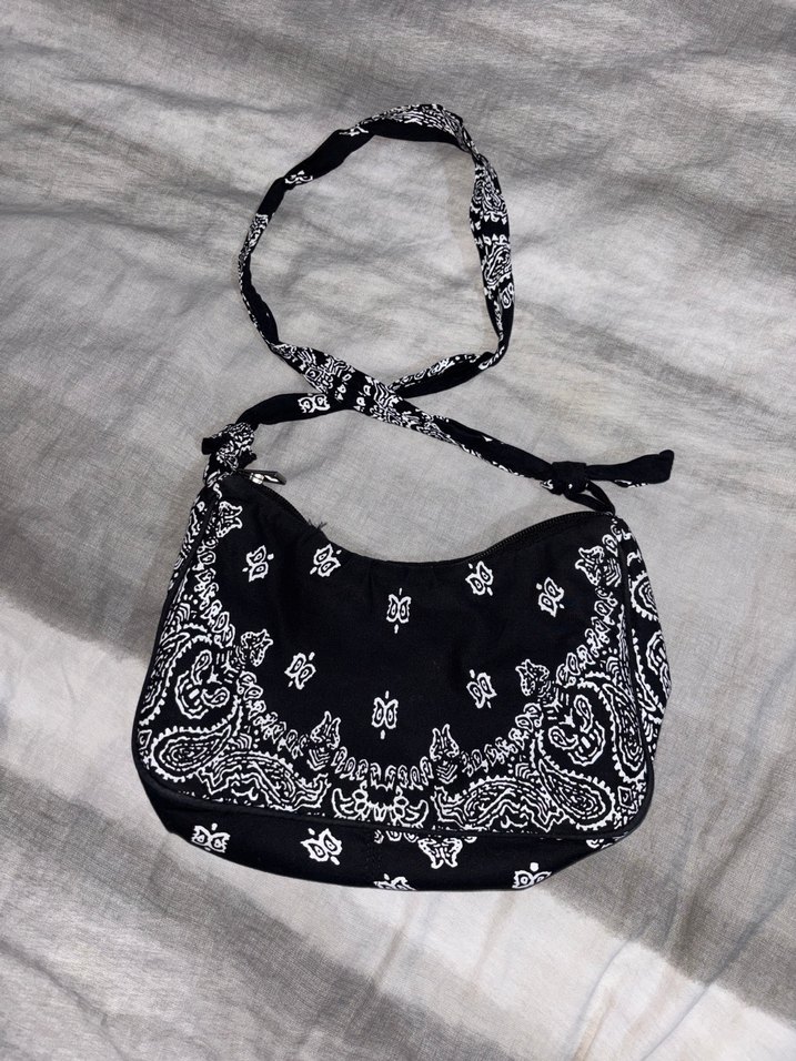 Kemerli askısı ve siyah beyaz batik desenleriyle bohem tarzda tekstil kadın çantası, günlük kullanıma uygundur.