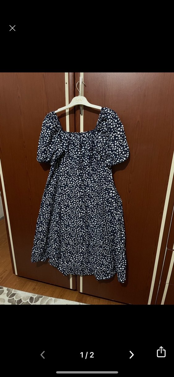 Siyah beyaz çiçek desenli midi elbise, pamuklu yumuşak kumaştan, kısa kabarık kollu ve kayık yakalı, bol kesim rahat bir modeldir. Hiçbir defosu yoktur. Sadece 1 kez giyildi. Yırtmacı vardır.