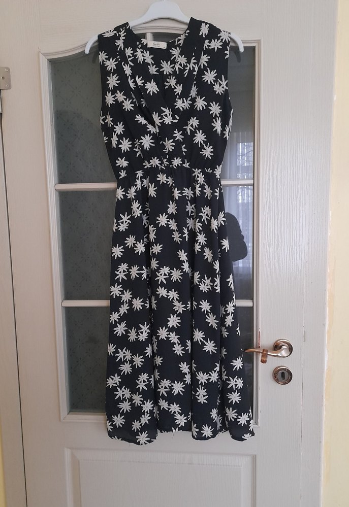 Siyah uzun elbise, V yaka ve pileli detaylara sahip. Askılı, beyaz çiçek desenli ve yumuşak sentetik kumaştan yapılmıştır. Günlük kullanım için uygundur. Göğüs 45 Boy 110 ✨️