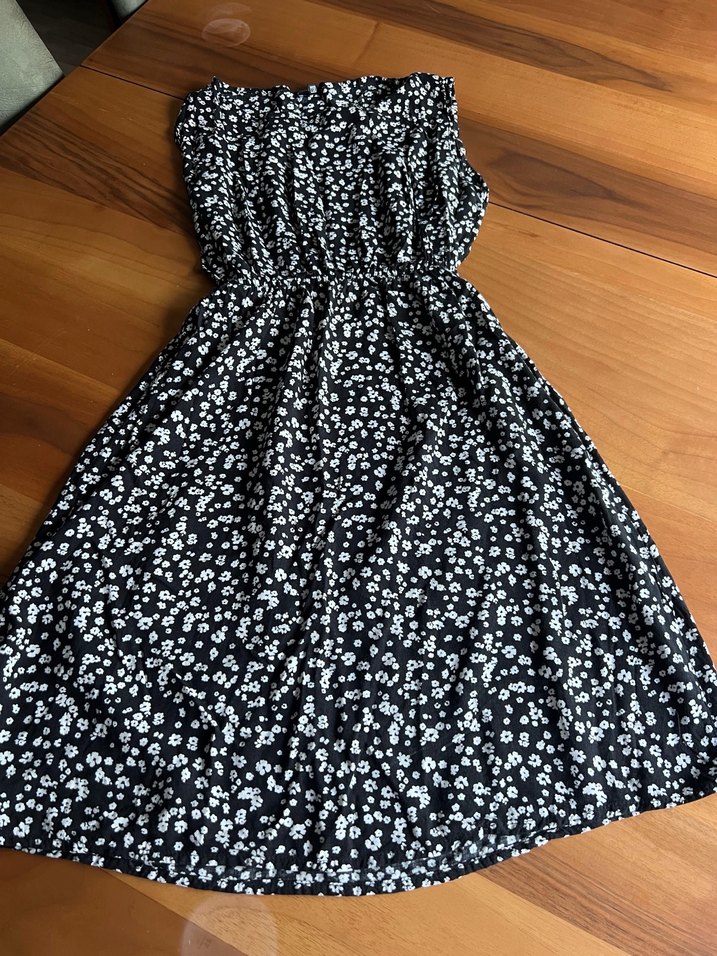 Siyah, küçük beyaz çiçek desenli elbise. Yumuşak sentetik kumaştan, vintage bohem tarzında, belden oturan ve fırfırlı detaylı.