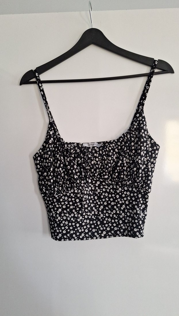 İnce askılı, V yakalı, düğmeli ön kısmı ve beyaz çiçekli desenli siyah fit kesim büstiyer, gündelik sokak stili için uygun.