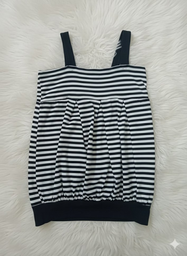 Siyah beyaz çizgili, askılı, pileli bluz. Rahat kesim ve sentetik kumaştan, sokak stiline uygun.