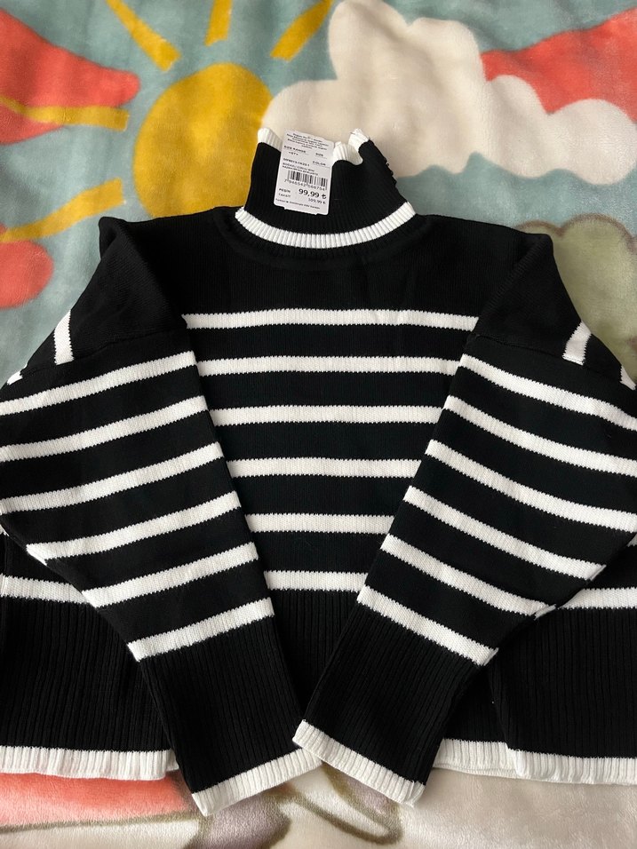 Siyah ve beyaz çizgili, boğazlı ve uzun kollu, rahat triko kumaştan yapılmış, günlük kullanıma uygun dar kesim kazak.
