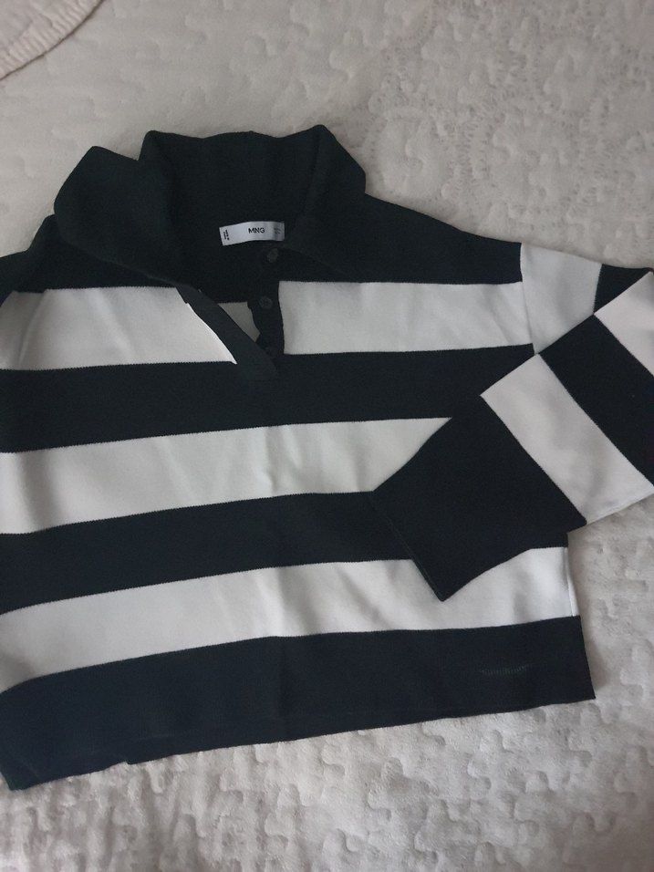Bol kesim, uzun kollu, düğmeli ve yakalı kadın sweatshirtü. Geniş gri ve beyaz çizgilerle günlük rahat stil için uygundur. Yumuşak ve sıcak kumaştan üretilmiştir.