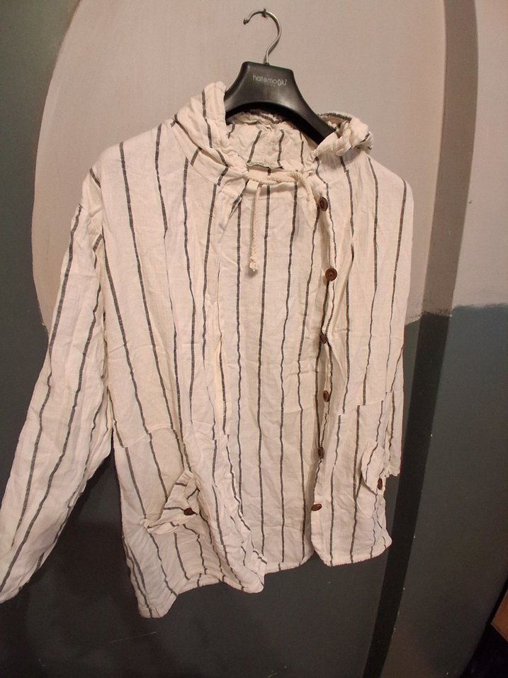 siyah beyaz Çizgili Düğmeli Keten Gömlek