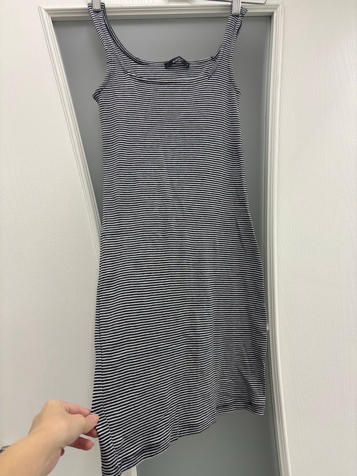 çizgili, kolsuz mini boy, fitted kesim ve tekne yakalı elbise, yumuşak sentetik kumaştan üretilmiş, günlük kullanım için uygun.