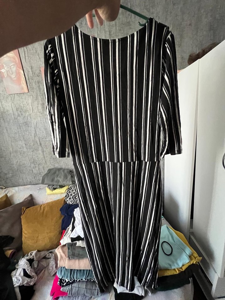 Gri çizgili, V yaka ve askılı kollu, pileli detaylı, rahat sentetik kumaştan yapılmış, günlük kullanıma uygun, vücuda oturan elbise