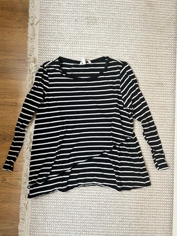 Siyah beyaz çizgili, uzun kollu, kayık yaka emzirme tişörtü. Pamuklu, rahat kesim ve midi boyda, günlük kullanım için uygun şık bir parça.