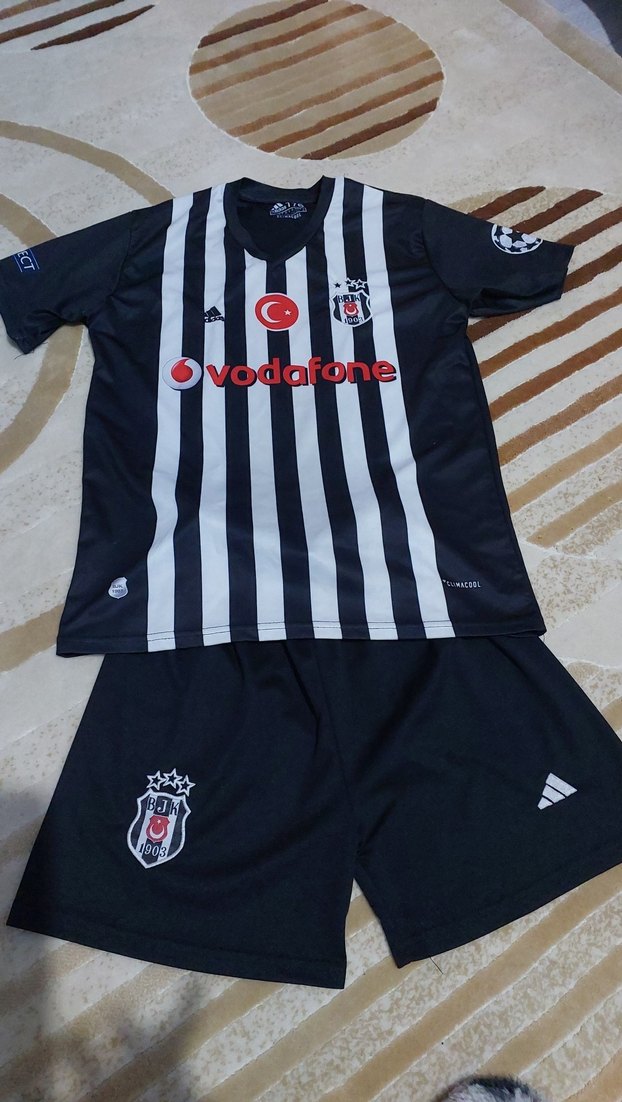 Erkekler için siyah beyaz çizgili kısa kollu, bol kesim forma üstü ve siyah şort takımı. Yuvarlak yakalı ve sentetik kumaştan, günlük sokak stili için uygundur. Velcro detayları ve spor logoları bulunur. ⚽ besıktas forma 176 beden .10.12 yaş arası
