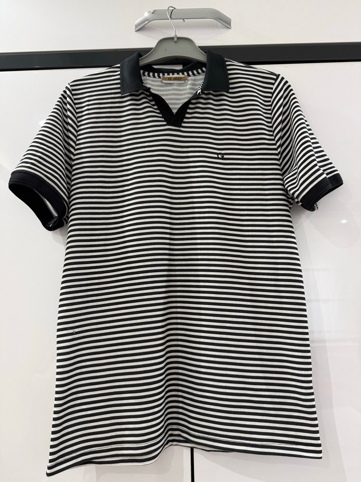 Kısa kollu, düğmeli yakalı erkek polo tişört. Siyah beyaz çizgili desene sahip, sentetik kumaştan üretilmiştir. Günlük kullanıma uygundur.