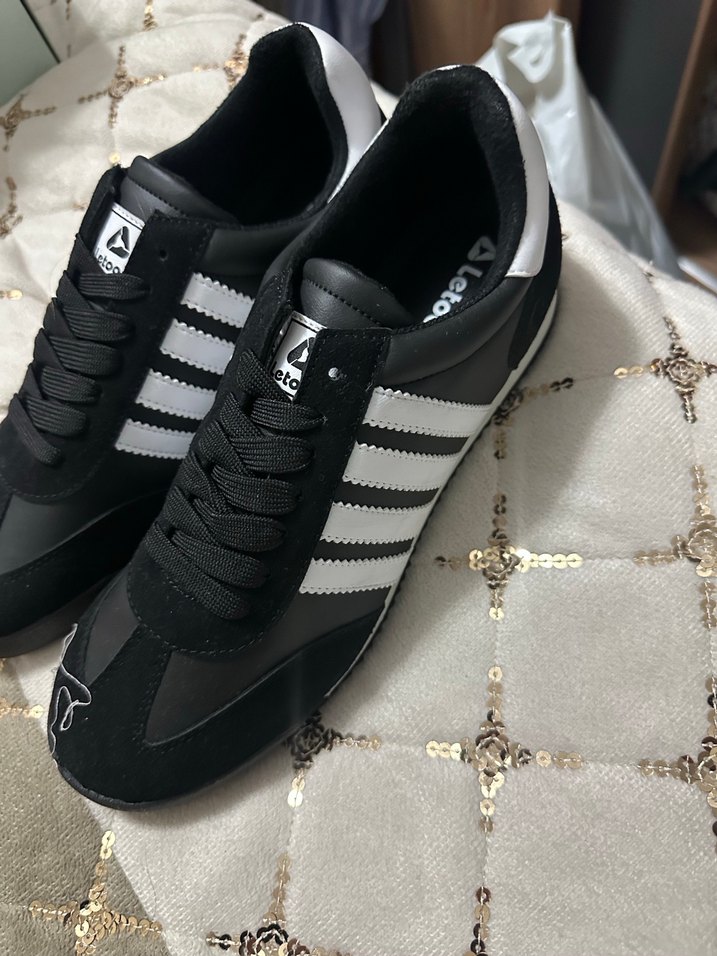 Siyah ve beyaz çizgili, kauçuk tabanlı erkek spor ayakkabısı, sportif ve günlük sokak stili için uygun.