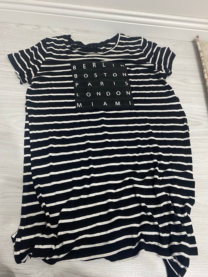 Pamuk kumaştan, kısa kollu ve tekne yakalı siyah beyaz çizgili hamile midi elbise. Rahat kesim ve düğme detaylı, günlük kullanıma uygun. ✨