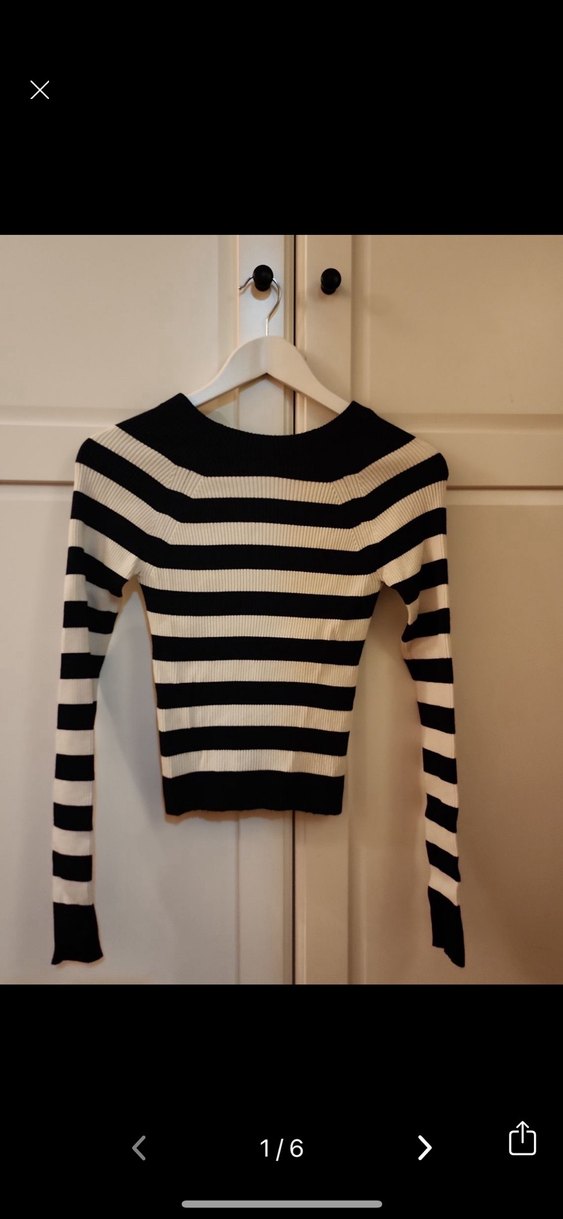 Uzun kollu, bisiklet yaka, ince triko kumaştan yapılmış siyah-beyaz çizgili, vücuda oturan kadın kazak.