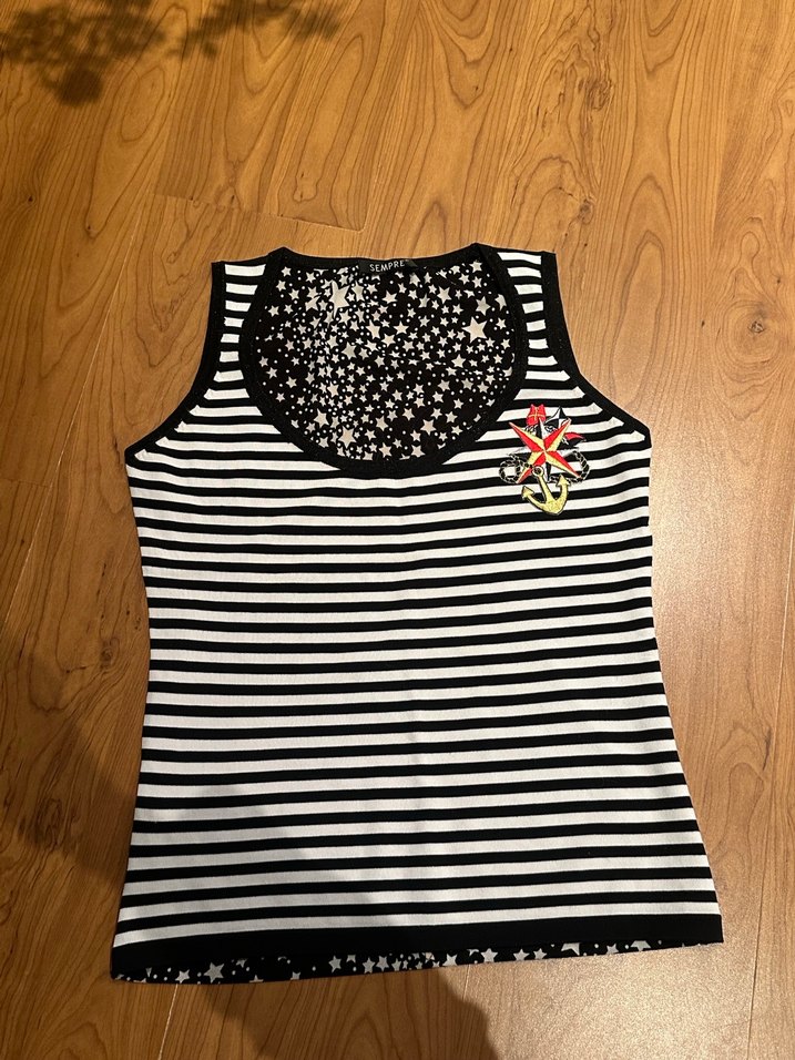 Fitted kesim, kolsuz, siyah beyaz çizgili kadın atlet. Düğme detaylı, içerisi yıldız desenli m-l beden uyumlu