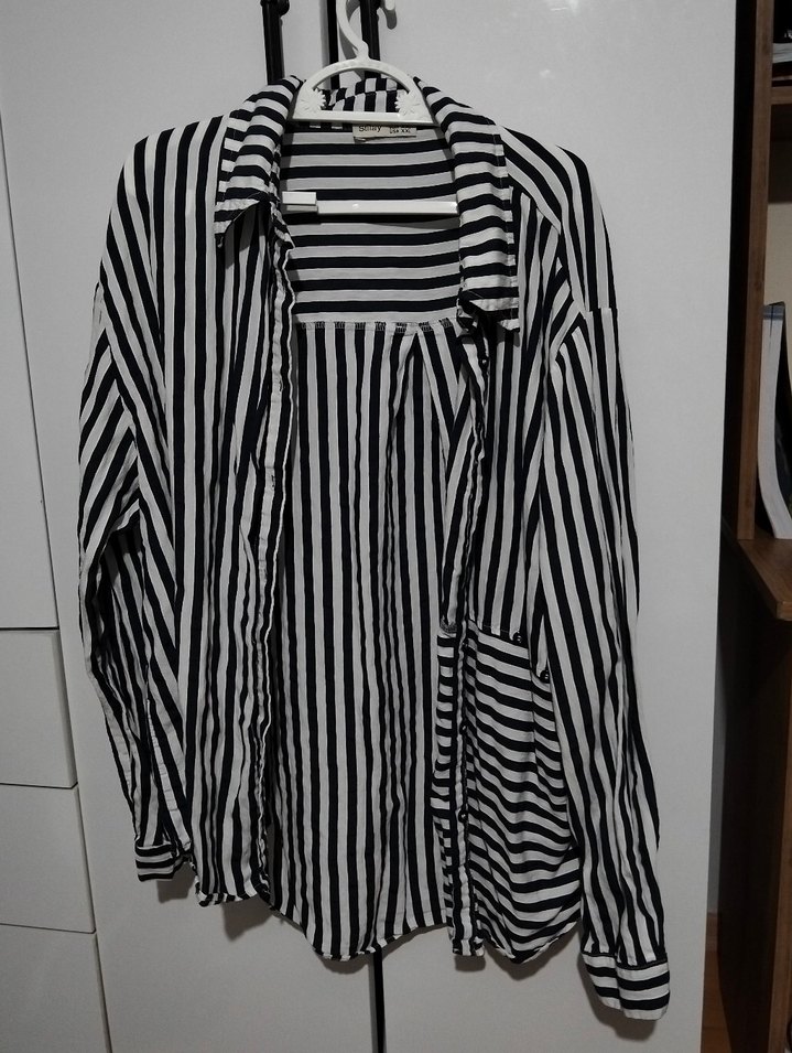 Siyah-beyaz çizgili, uzun kollu, yakalı ve pile detaylı bol kesim kadın gömlek. Yumuşak sentetik kumaştan üretilmiştir, gündelik kullanıma uygundur.