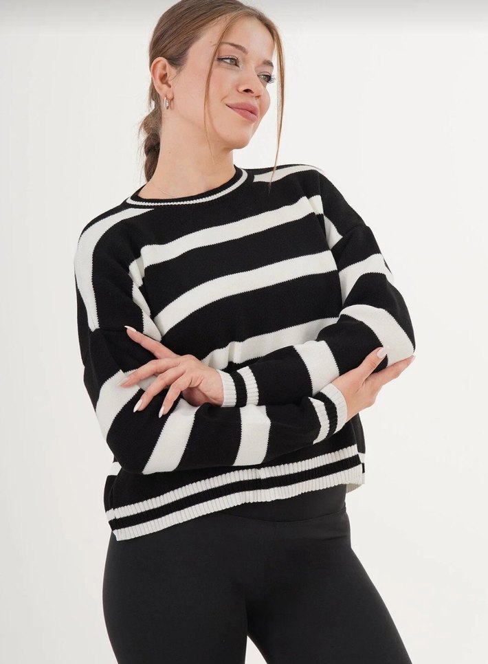 Siyah beyaz çizgili, yuvarlak yaka ve uzun kollu, kısa kesim bol triko kazak, günlük rahat kullanım için uygundur.
