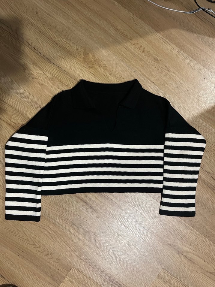 Fitted kesim, uzun kollu kadın triko bluz. Siyah üst kısmı ve çizgili kollarıyla günlük kullanıma uygun şık bir model.