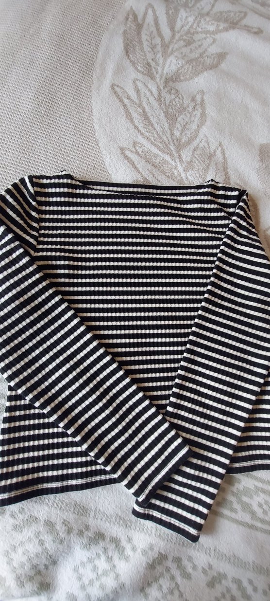 Beyaz ve siyah çizgili, tekne yaka ve uzun kollu triko bluz. Normal boyda, Paris tarzı ve rahat kesim.