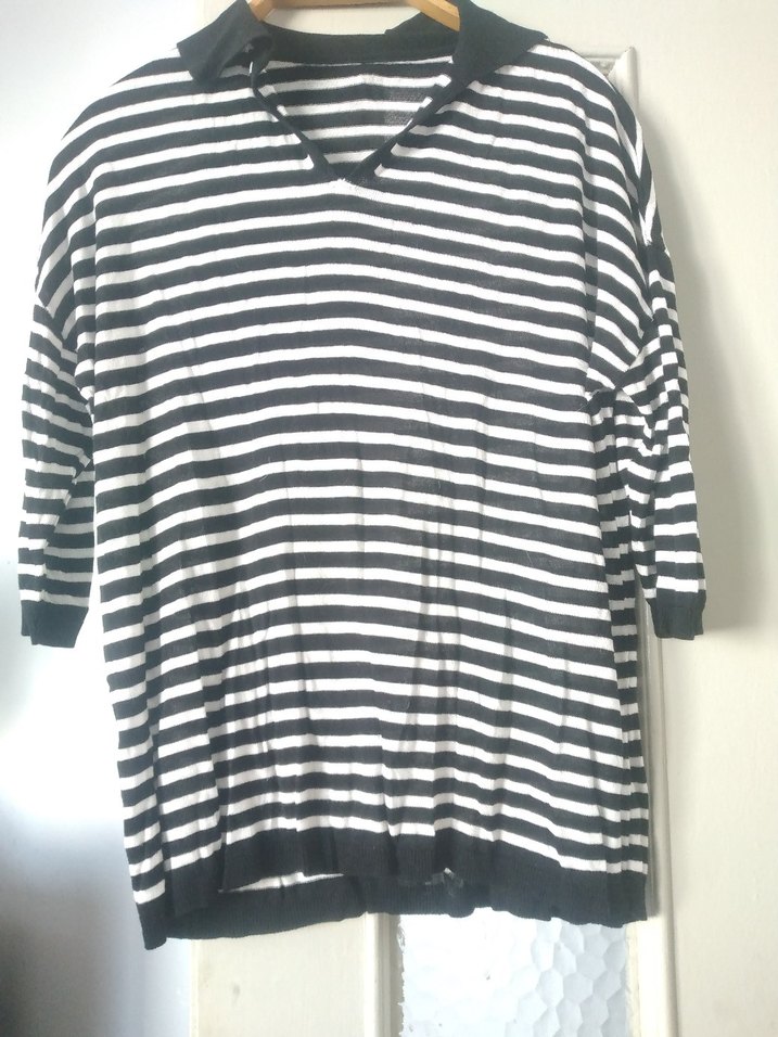 Pamuklu, yarim kollu, yakalı ve bol kesim çizgili triko kazak. siyah ve beyaz renklerde, günlük rahat stil için uygundur. polo yaka..m ve l bedene uyar. az giyildi. ince.