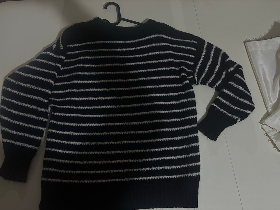 STANDART BEDEN Kadınlar için yuvarlak yaka, uzun kollu, bol kesim triko kazak. Yumuşak sentetik kumaştan örülmüş, siyah beyaz çizgili desenlidir ve rahat sokak stiline uygundur.