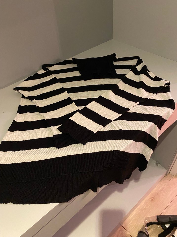 Siyah beyaz çizgili, uzun kollu, salaş kesim ve tekne yaka triko kazak. Midi boy, rahat ve sokak modasına uygun, günlük kullanıma uygun.
