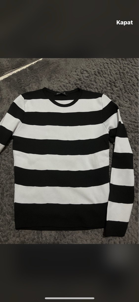 Bu kadın triko kazak, uzun kollu ve yuvarlak yakalı, siyah beyaz geniş çizgilerle dikkat çeker. Yumuşak ve sıcak dokuma kumaştan üretilmiştir.