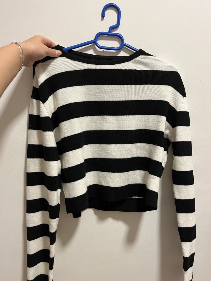 Siyah beyaz çizgili, ince triko kumaştan, uzun kollu ve bisiklet yaka, dar kesim kadın kazak. Günlük rahat sokak stili için uygundur.
