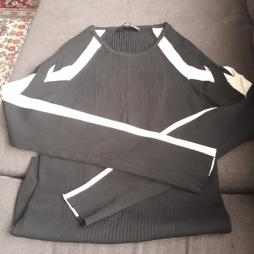 Siyah taban üzerine beyaz çizgilerle detaylandırılmış, bisiklet yaka ve uzun kollu, vücuda oturan kadın triko kazak. Yumuşak sentetik kumaştan, günlük ve sokak stiline uygun.